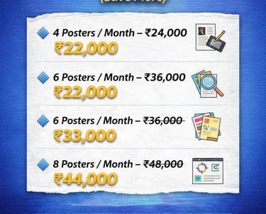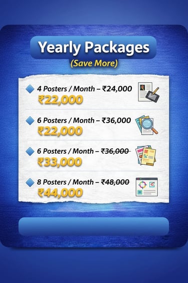Clean, modern monthly poster packages designed to boost your brand visibility—choose 4, 6, or 8 creatives per month based on your promotion needs at an affordable price.